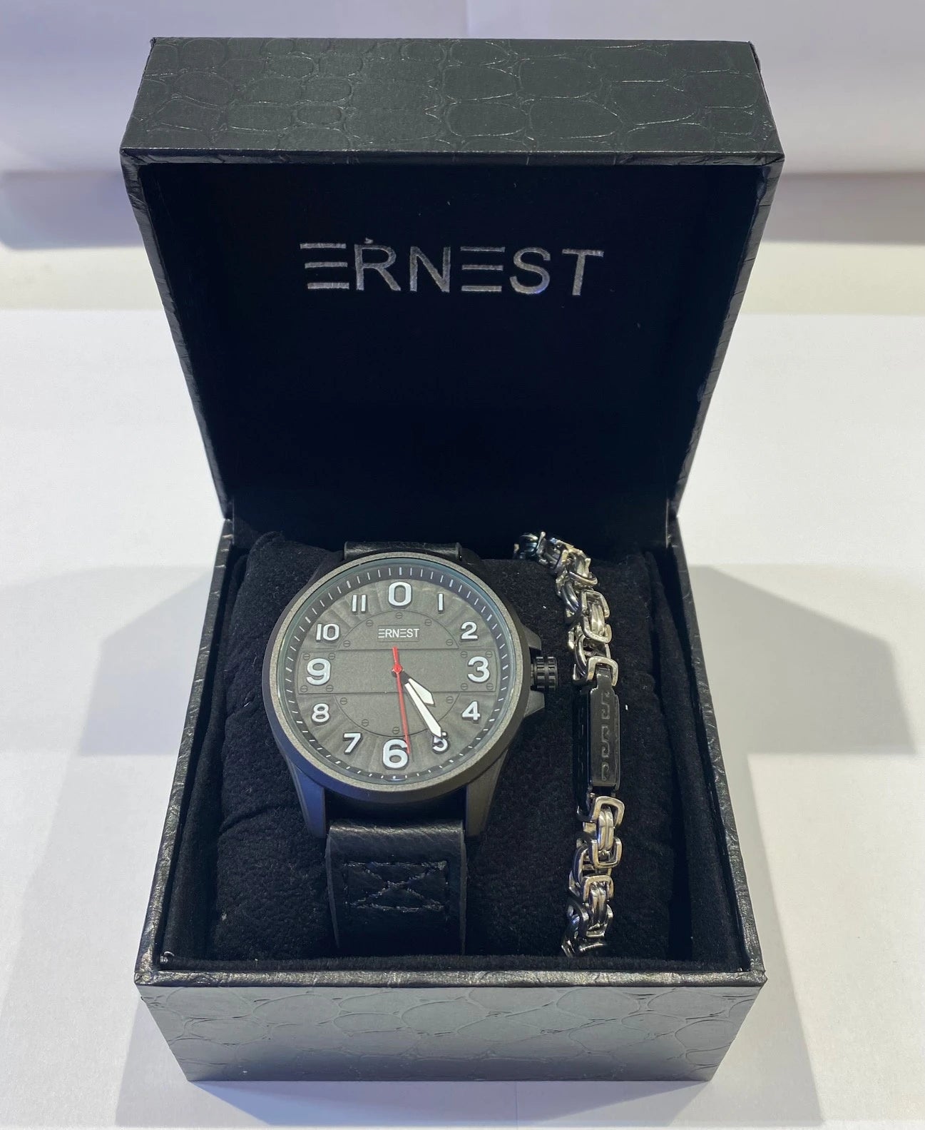 Un élégant coffret cadeau pour homme comprenant un bracelet en acier et similicuir, livré avec une pochette cadeau offerte, idéal pour offrir ou se faire plaisir.